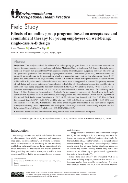 日本の研究者らは、若手従業員を対象としたACTに基づくオンライン集団プログラムが、ウェルビーイング、仕事遂行能力(WP)、仕事への没頭感(WE)、ストレス反応、価値ある行動の頻度、心理的柔軟性の欠如(PiF)に及ぼす影響を検証する研究を実施した。本研究では、介入後、各指標が参加者ごとに良好な傾向を示すと仮説を立てた。研究者は単一A-Bデザインを採用し、参加者はベースライン段階(フェーズA)と介入段階(フェーズB)を同時に開始した。対象はA社従業員24名で、全員が大学卒業または大学院修了後3年以内であった。A社はサービス業に従事し、日本企業向けメンタルヘルスケアサービスの提供を専門としている。介入はACTに基づくオンライングループプログラムで、各グループ12名、Microsoft Teams®ビデオ会議システムを用いて実施。全3セッション(各90分)で構成された。ベースライン段階(時点1~5)は15日間、介入段階(時点6~10)は35日間にわたって実施された。