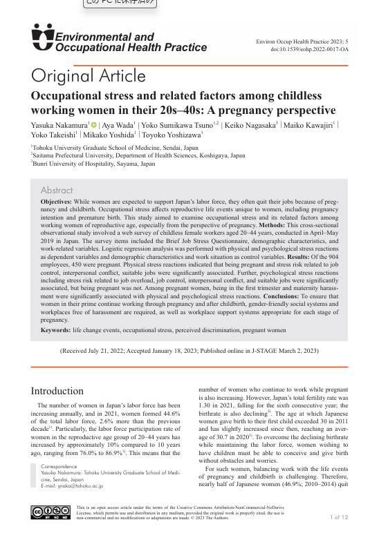 Occupational stress and related factors among childless working women in their 20s–40s: A pregnancy perspective
