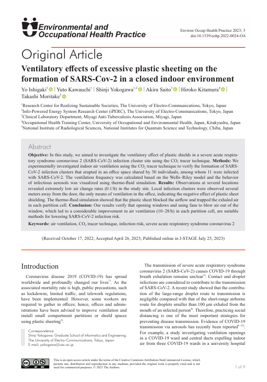 本研究対象となった宮城県内の空調オフィスでは、30名の従業員のうち11名がCOVID-19に感染した。オフィスはプラスチック製パーティションで5区画に分割されていた。管理者への聞き取りによると、従業員は書類作業に従事していたが、業務の性質上、広範囲な対面接触が発生していた。一部の従業員はウレタン製または布製マスクを着用していた。当該オフィスには機械換気システムや室内扇風機などの追加換気設備が設置されていなかった。したがって自然換気はドアや窓を開けることでのみ可能であった。
