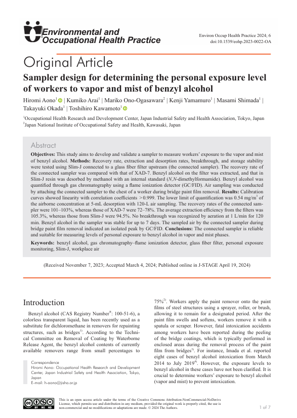 This removal process of the paint from bridges often occurs in enclosed spaces, and there are reports of fatal intoxication accidents; however, the exposure level that led to these fatal intoxications is unknown. Thus, it is important to monitor the levels of benzyl alcohol in workplace air. The United States Department of Labor’s Occupational Safety and Health Administration (OSHA) aims to measure the vapor form of benzyl alcohol and recommends the use of XAD-7 without a glass fiber filter. However, the workers frequently apply the paint removers using sprayers and the mist from benzyl alcohol containing removers is widely recognized as the primary source of exposure to the workers.
